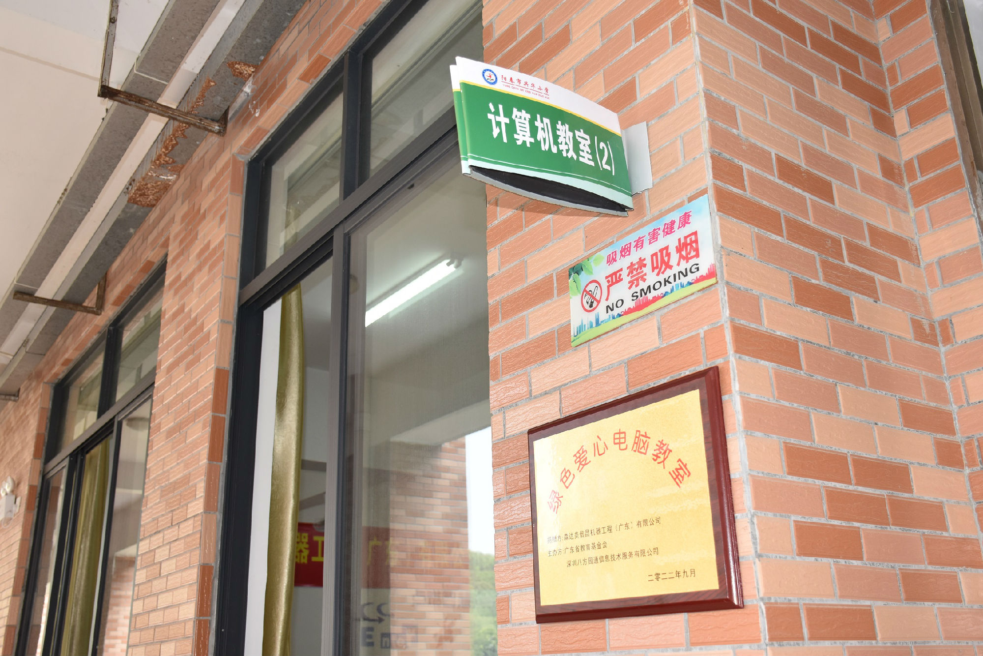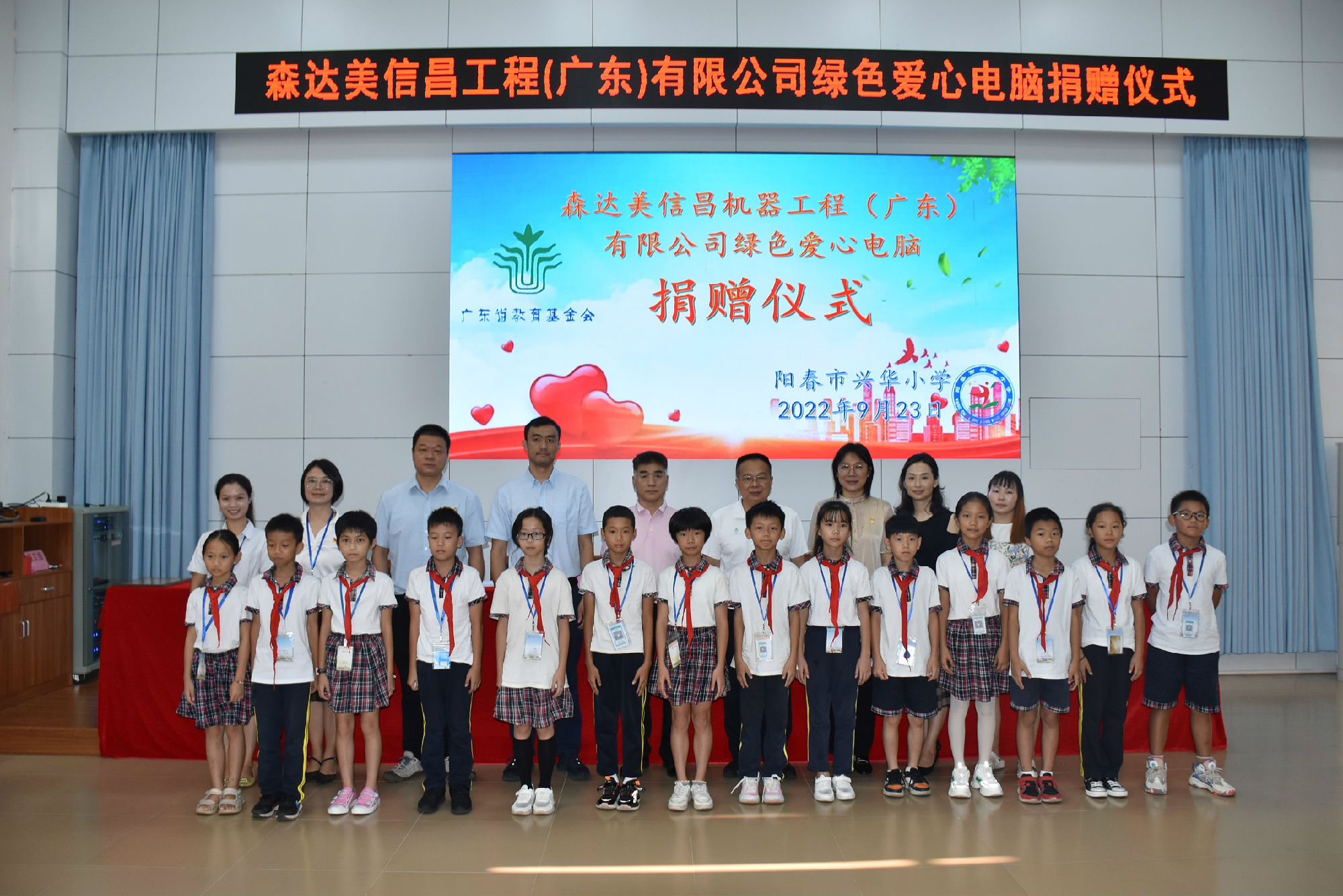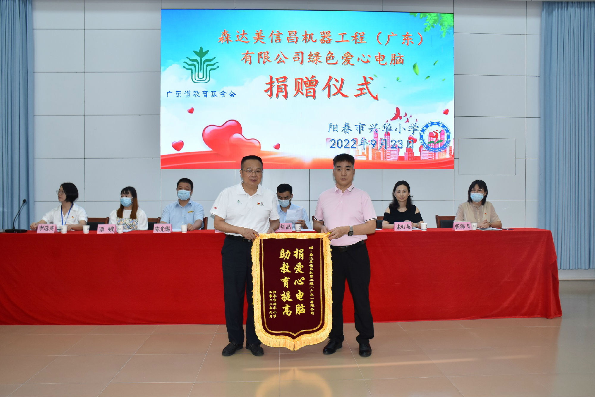 森達(dá)美信昌機(jī)器工程(廣東)有限公司員工關(guān)系經(jīng)理劉祥向興華小學(xué)贈(zèng)送“綠色愛(ài)心電腦教室”牌匾,興華小學(xué)李選英校長(zhǎng)接收牌匾